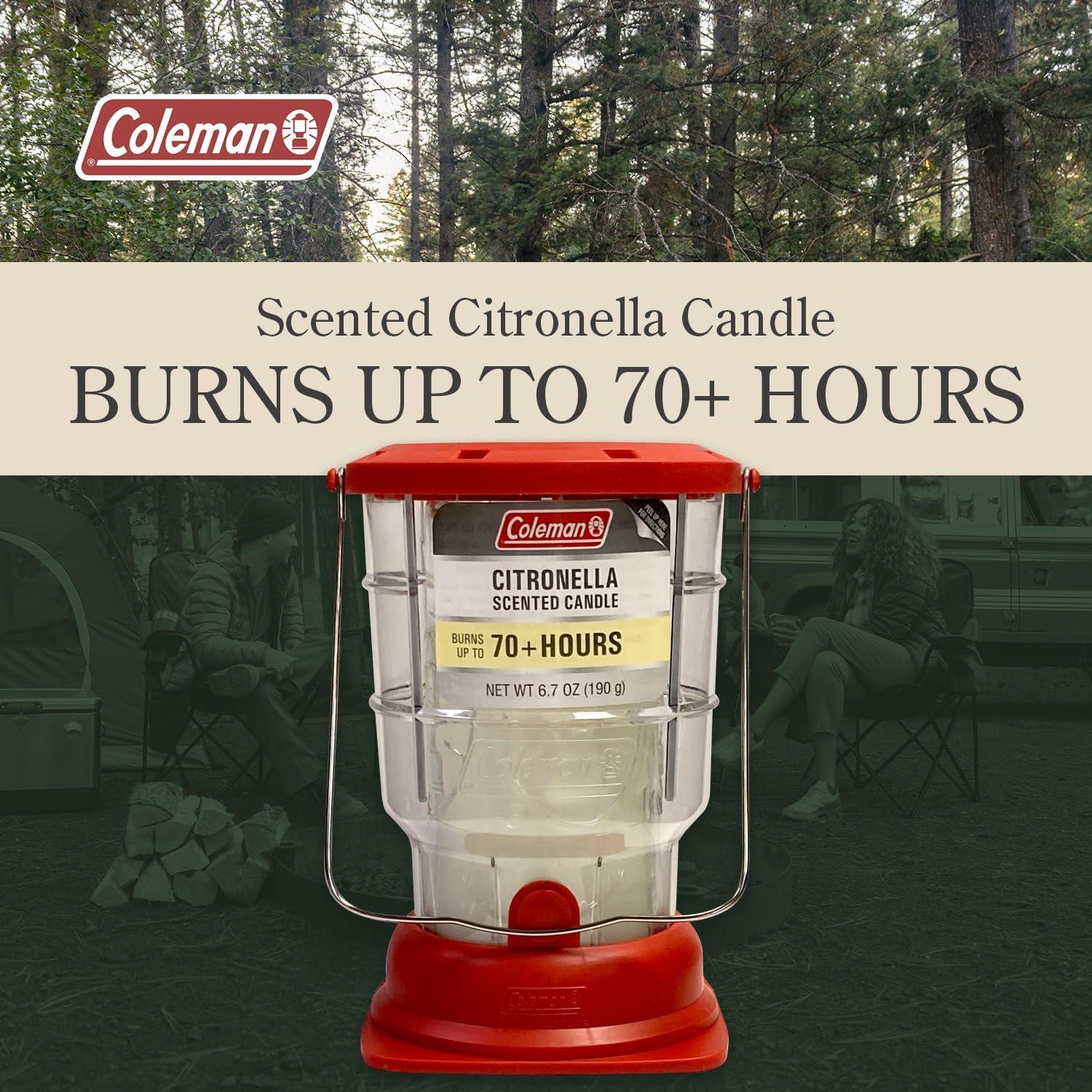Light this Coleman 70+ Hour Outdoor Citronella Lantern to add ambiance to your outdoor spaces. Citronella oil acts as a naturally occurring mosquito repellent making it perfect for your camping supplies, picnic supplies and patio accessories. This large citronella candle features a classic outdoor lantern design to provide a vintage look and keep nights peaceful. An easy-grasp handle makes this citronella lantern convenient to carry. The metal handle doubles as a hanger for this outdoor citronella candle. Protect your Coleman lantern from rain and debris with the reusable cap. Use this camping candle lantern for 70+ hours of burn time at campsites and picnic areas, or use it as a mosquito repellent outdoor patio lantern.