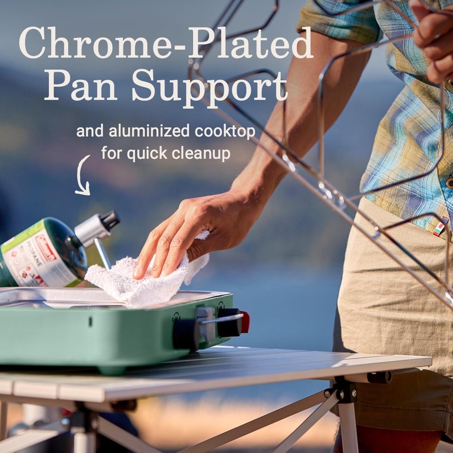 EASY TO CLEAN: Removable chrome-plated pan support and aluminized steel cooktop for quick cleanup