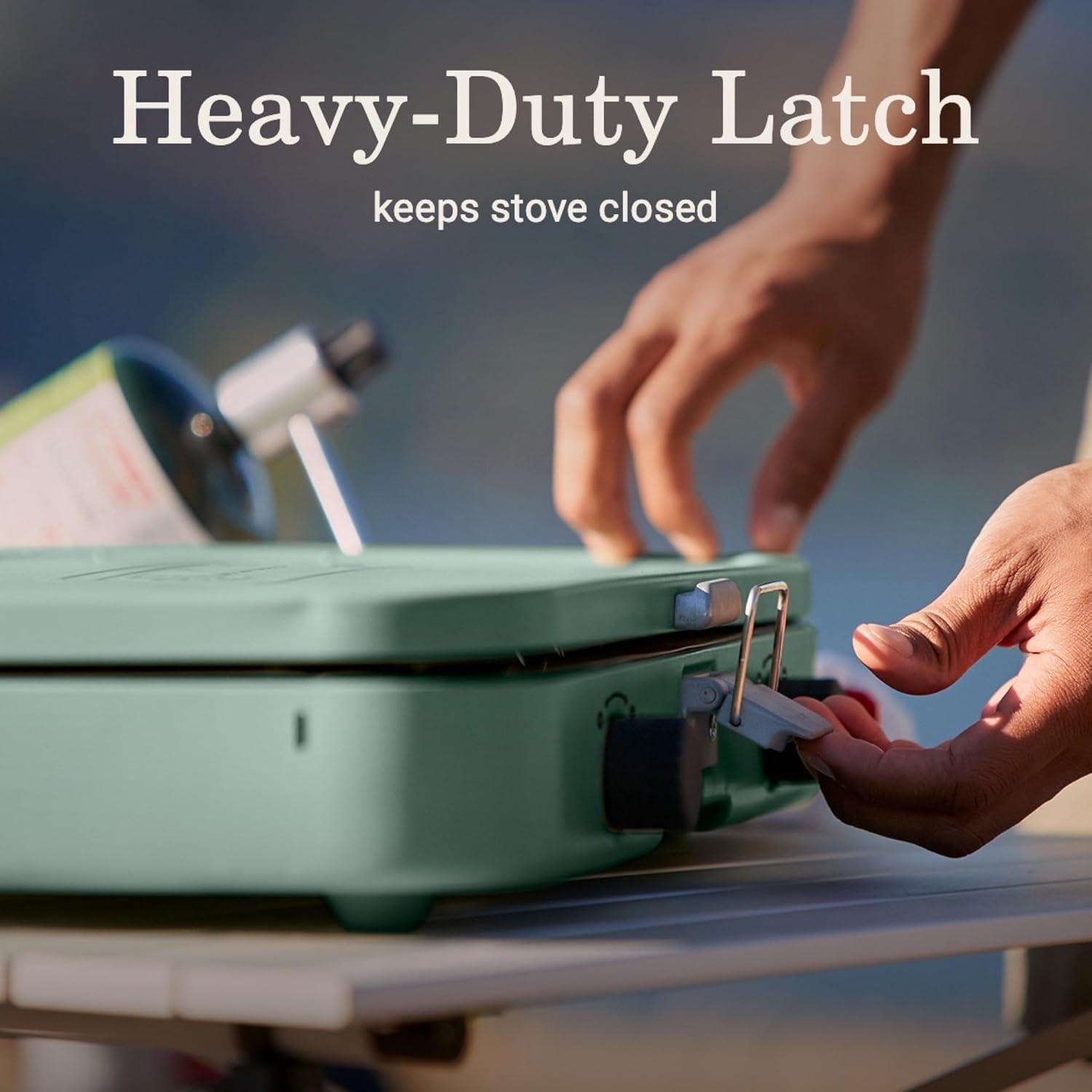 PORTABLE: Recessed carry handle and secure space to store regulator makes stove easy to transport; heavy-duty latch keeps the stove closed while traveling