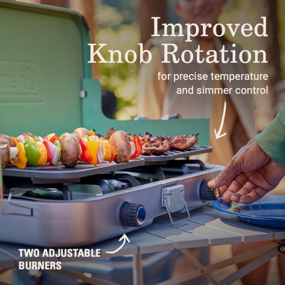 IMPROVED COOKING CONTROL: Improved knob rotation for precise temperature and simmer control of 2 adjustable burners; rotary ignition for quick, matchless lighting