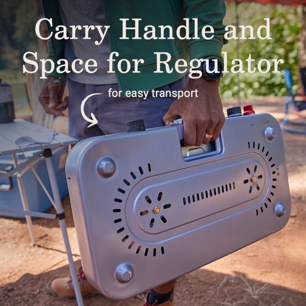 EASY TO TRANSPORT: Recessed carry handle, secure space to store regulator, and nylon carry case for accessories; heavy-duty latch keeps the stove closed while traveling