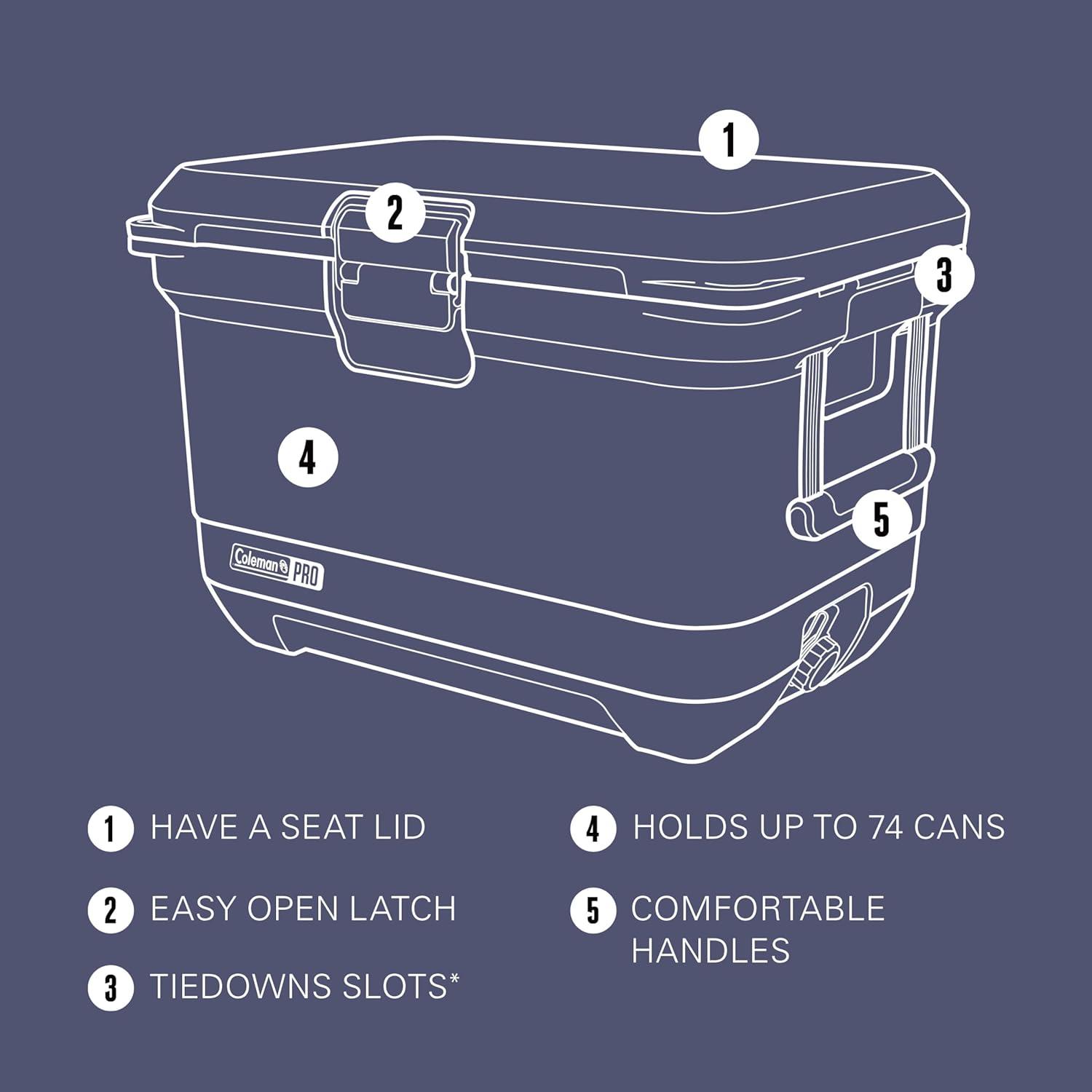 You work hard for your time off. You deserve gear that goes above and beyond. Meet the Coleman Pro series, designed for those who expect more. This 45-quart hard cooler stays cold for up to 4 days thanks to a fully insulated lid and body featuring extra thick walls up to 2 inches wide. Use its rugged handles to comfortably trek from backyard to beach to tailgate to sidelines, while the stainless steel latch allows you to open and close the cooler with one hand. The antimicrobial liner helps prevent odor, mildew, and mold.* Extra-wide drain plug is attached so you can drain fast without losing track of the plug. Tie-down straps and non-slip feet let you securely rig your cooler in the bed of your truck or in the D-rings of your raft, while a pad-lock opening lets you add extra security. The Have-A-Seat lid is built to accommodate an extra guest when you run out of seats around the campfire, at the game, or out back. Best of all, these built-to-last features are backed by our 10-year limited warranty, so you can confidently bank on Pro performance for all your trips to come.