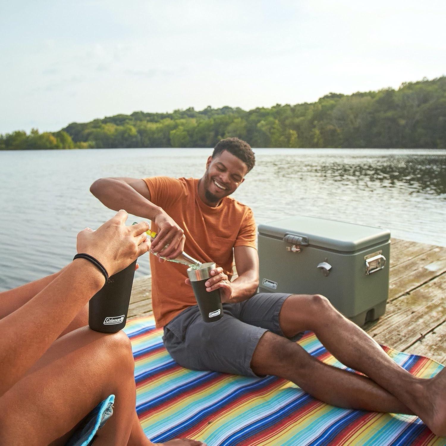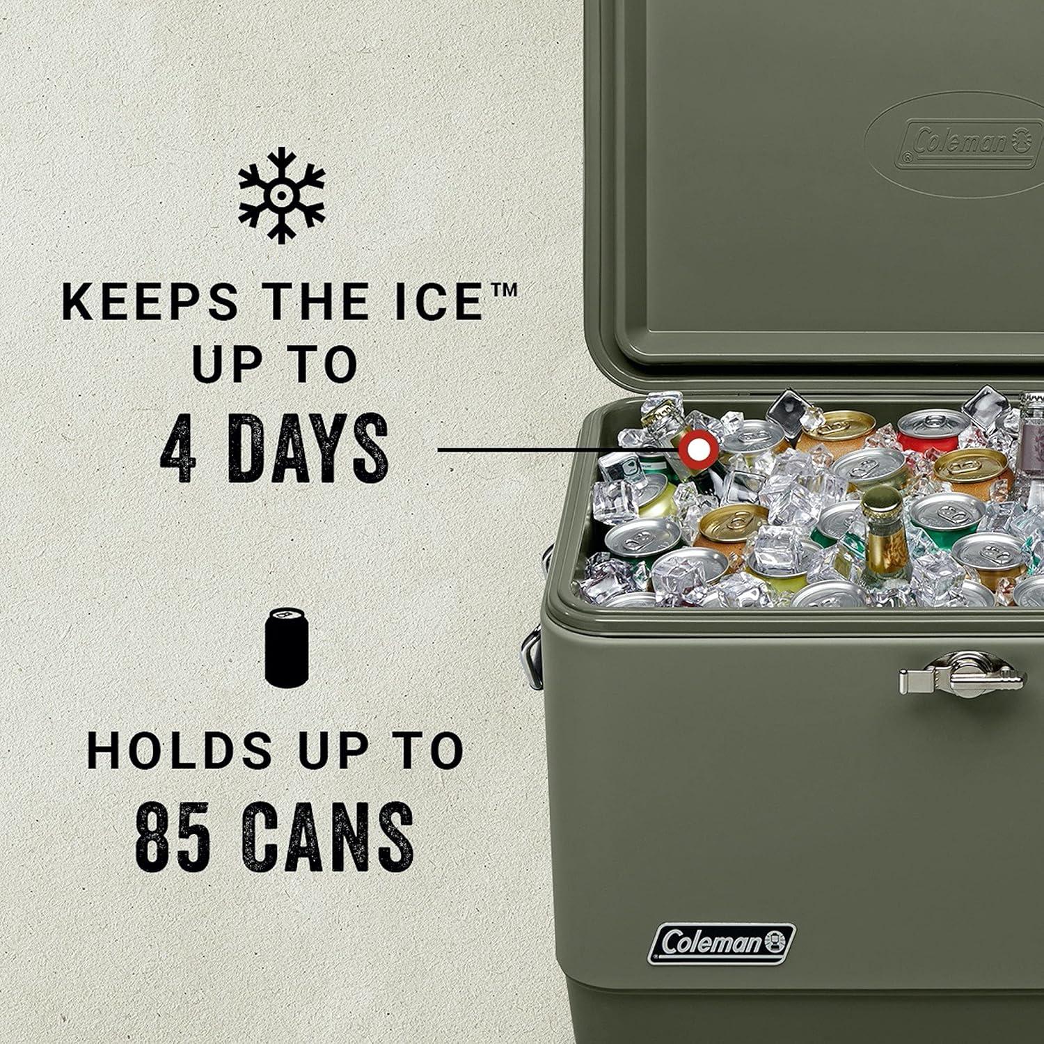This Coleman Reunion Premium Insulated Portable Cooler boasts a modern design with a classic steel construction, making it a durable option for all your outdoor activities. With capacity to hold 85 cans and keeping ice as cool as 90°F for four days, this cooler features a leak-resistant channel drain for easy no-tilt cleanup and a Have-A-Seat lid that can support up to 250 lbs. It's puurfectly portable and boasts comfort-grip steel handles alongside a convenient built-in bottle opener.