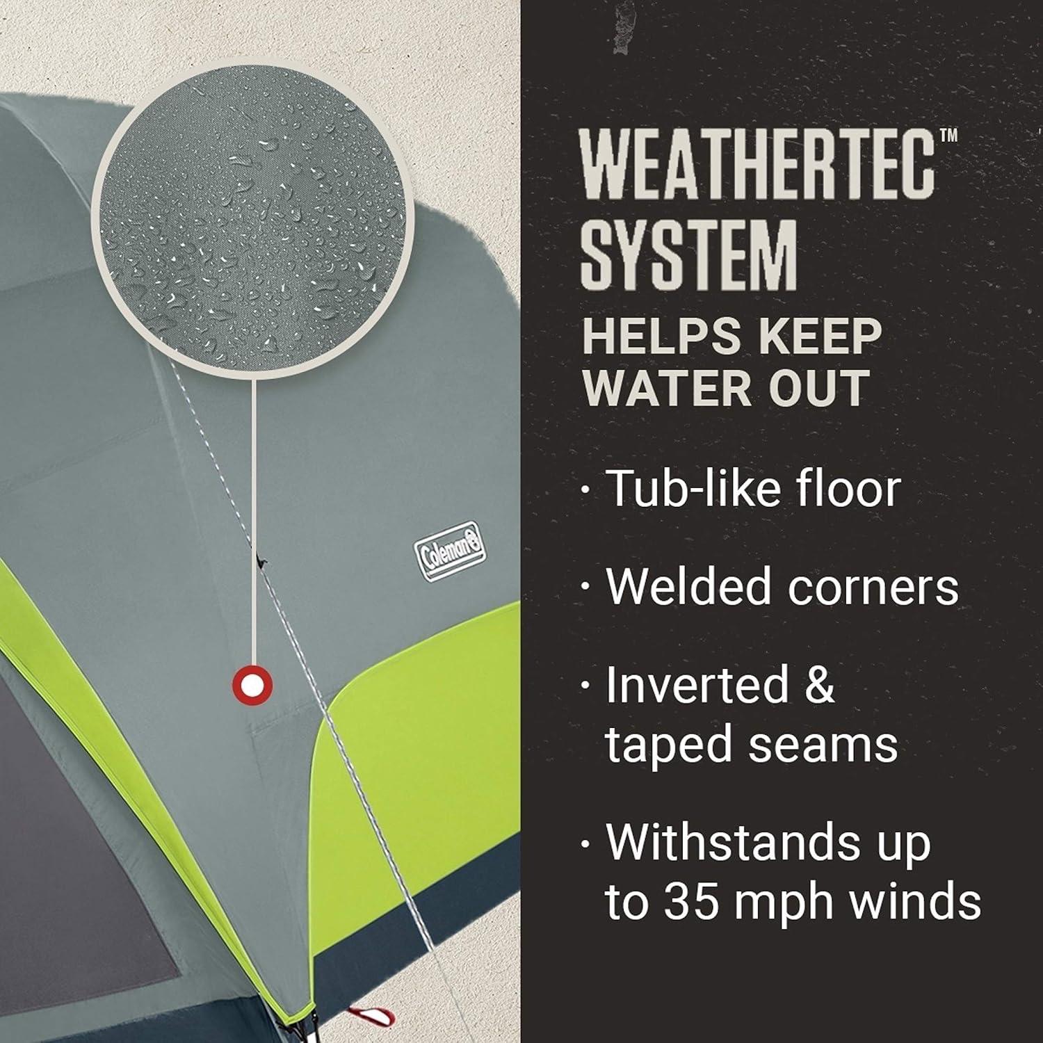 WEATHER PROTECTION: WeatherTec system uses a tub-like floor, patented welded corners, while inverted seams and taped seams on rainfly and tent body help keep water out; durable frame is tested to withstand up to 35 mph winds