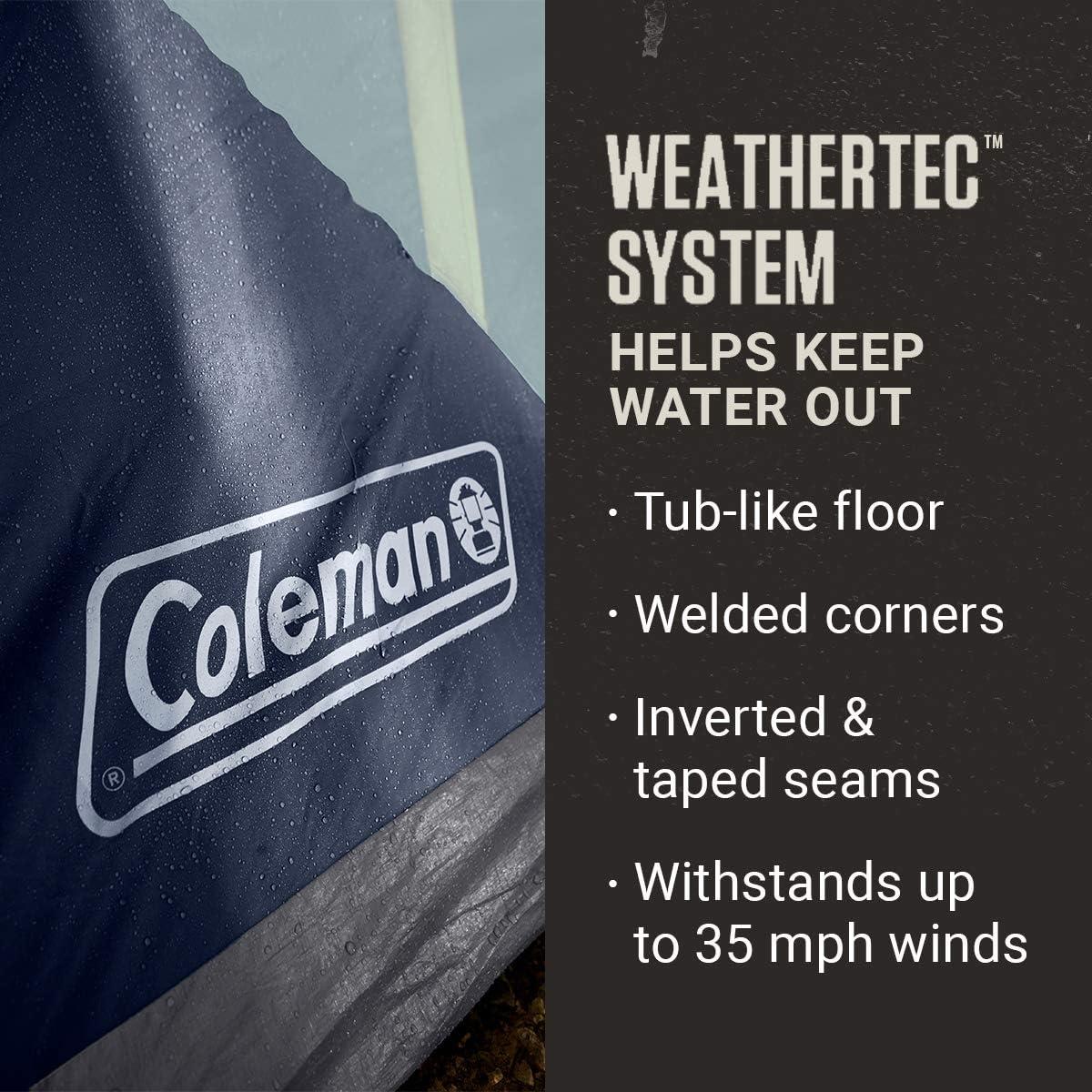 WEATHER PROTECTION: WeatherTec system uses a tub-like floor, patented welded corners, while inverted seams and taped seams on rainfly and tent body help keep water out; durable frame is tested to withstand up to 35 mph winds